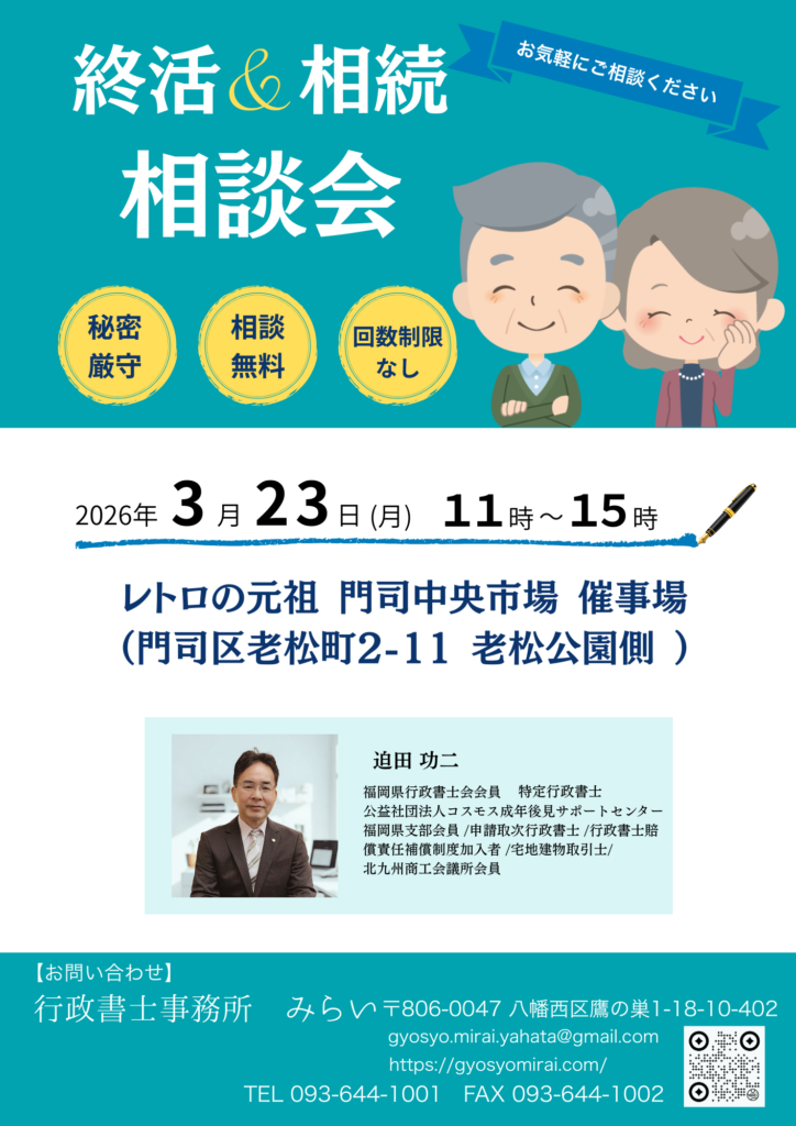 終活・相続の無料相談会を門司区にて開催します >>詳細はこちらへ